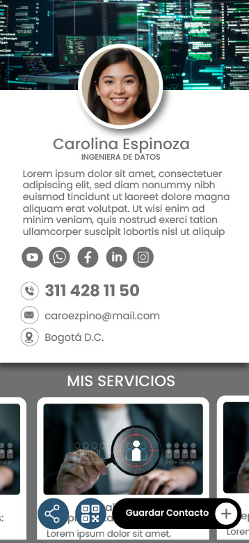 ¿Cansado de teclear números? Nuestras vcards digitales permiten compartir al instante tus datos de contacto, redes sociales, portafolios y mucho más, con un solo toque o un escaneo rápido.